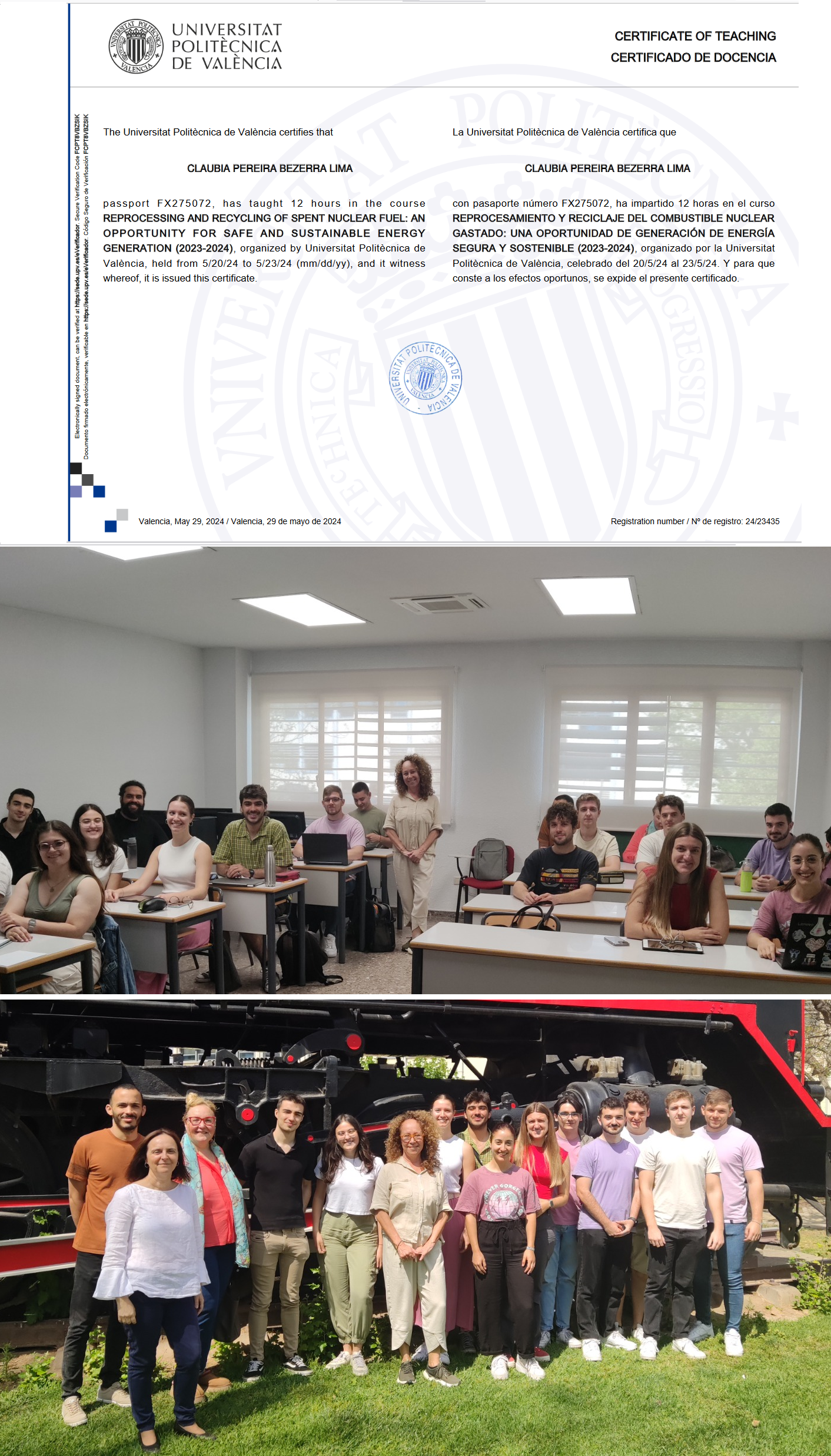 A Professora Claubia Pereira do Departamento de Engenharia Nuclear da Escola de Engenharia da UFMG ministrou dois cursos para estudantes de pós-graduação da Universidade Politécnica de Valência, na Espanha, entre os dias 20 e 23 de maio de 2024. Os cursos intitulados REPROCESAMIENTO Y RECICLAJE DEL COMBUSTIBLE NUCLEAR GASTADO: UNA OPORTUNIDAD DE GENERACIÓN DE ENERGÍA SEGURA Y SOSTENIBLE e REPROCESSING AND RECYCLING OF SPENT NUCLEAR FUEL: AN OPPORTUNITY FOR SAFE AND SUSTAINABLE ENERGY GENERATION foram promovidos pelo Instituto Universitario de Seguridad Industrial, Radiofísica y Medioambiental a convite do professor Sergio Gallardo Bermell e tiveram como objetivo oferecer aos participantes noções gerais e específicas sobre o ciclo do combustível nuclear, utilizações para o combustível queimado e impactos ambientais, reprocessamento e possibilidades de reinserção no ciclo do combustível, entre outros aspectos relacionados ao tema do curso, áreas de pesquisa e ensino em que a Profª Claubia tem vasta experiência.